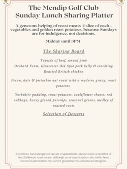 In addition to being a fantastic everyday spot for coffee, cake, sandwiches and more, Mendip Golf Club is also a fantastic venue for Sunday lunches, club / society get togethers, celebrations, wakes, Christmas parties & business meetings. Bespoke menus created when required, working closely with organisers to ensure events are tailored to their requirements.